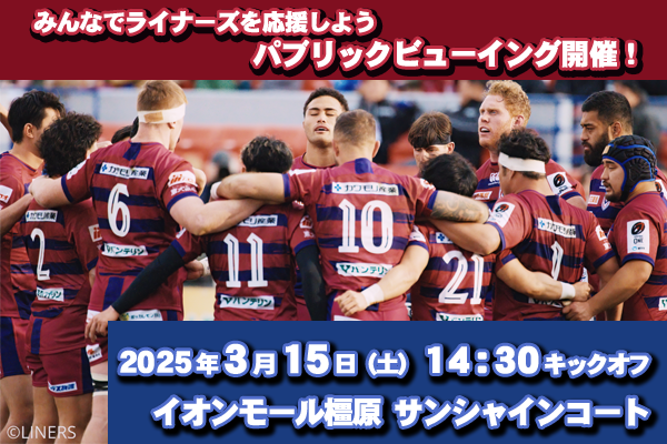 3月15日(土)開催のNTTジャパンラグビー リーグワン2024-25 Div.2 第8節 vs清水建設江東ブルーシャークス戦において、イオンモール橿原、近鉄ケーブルネットワーク、花園近鉄ライナーズの共催で「みんなでライナーズを応援しよう!パブリックビューイング」を開催しますのでお知らせいたします。詳細は以下のとおりです。
