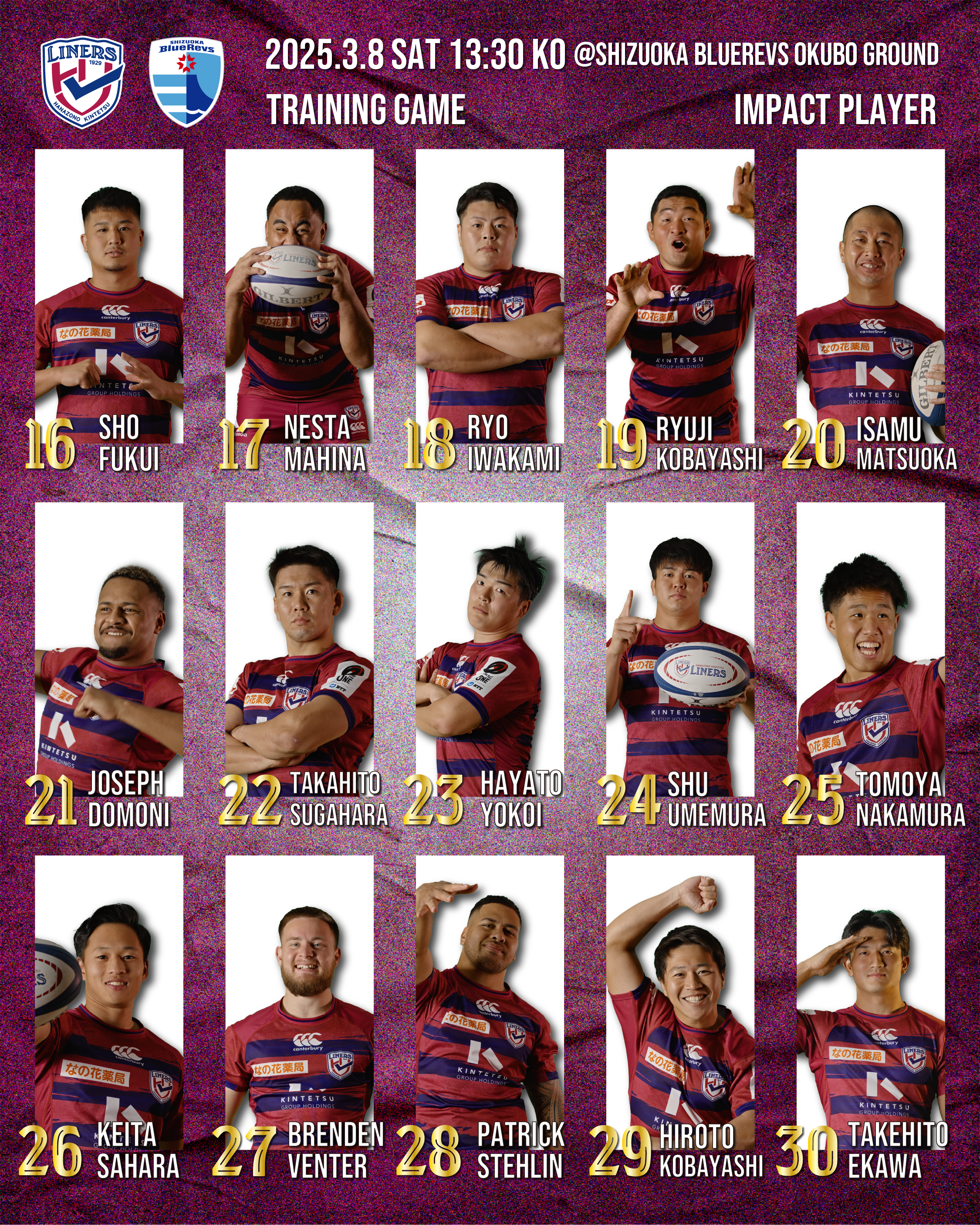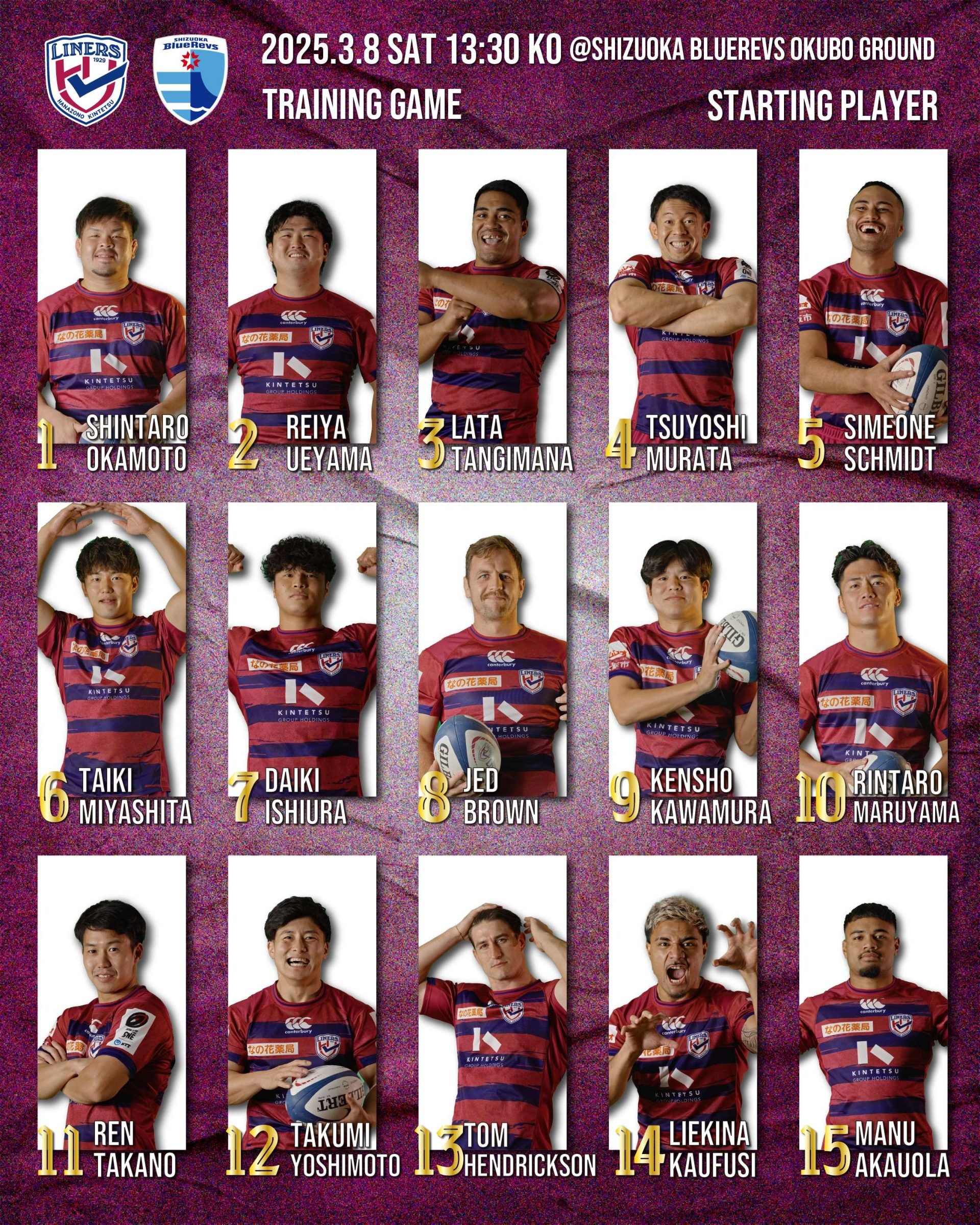 【トレーニングマッチ】静岡ブルーレヴズvs花園近鉄ライナーズ日時:2025年3月8日(土) 13:30K.O.観戦:非公開 ※試合結果のみお知らせメンバー: