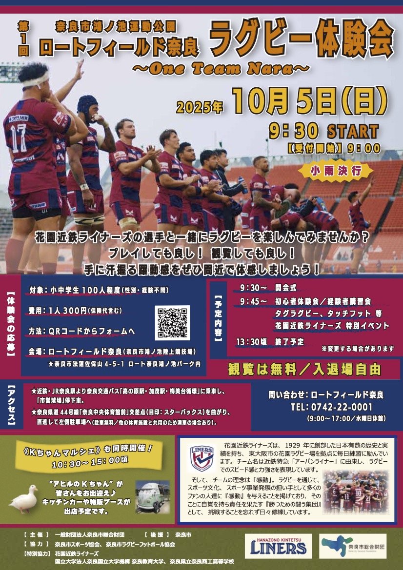 日頃は花園近鉄ライナーズへご声援を賜り誠にありがとうございます。2025年10月5日(日)、ロートフィールド奈良にて「第1回ラグビー体験会」が開催されます。ライナーズの選手も登場しますので、ぜひご参加ください。ご参加は事前応募制です。