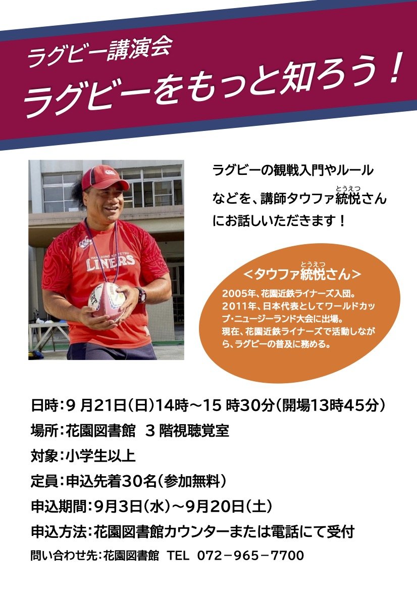 9/21 花園図書館にて「ラグビー講演会 ラグビーをもっと知ろう!」が開催されます