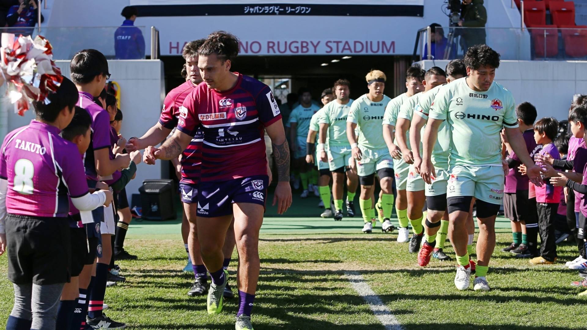 ピッチ脇で花道をつくり、グラウンドに入場する選手とハイタッチ!