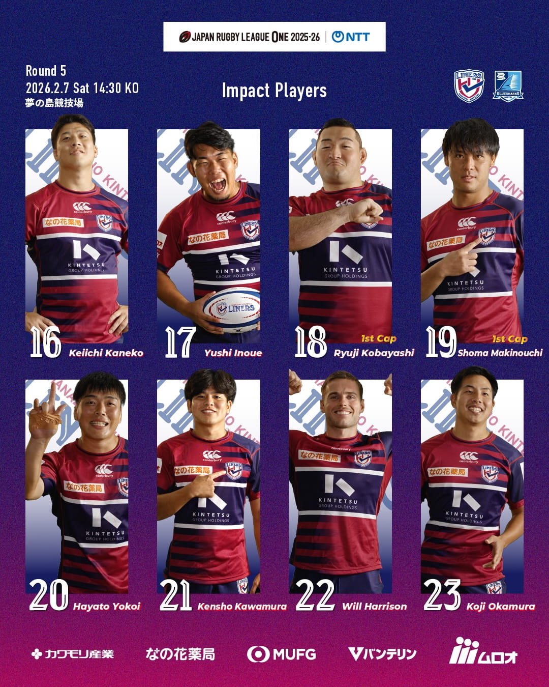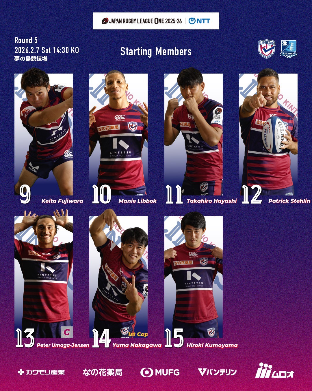 2/7 清水建設江東ブルーシャークス戦 メンバーおよび試合詳細のご案内