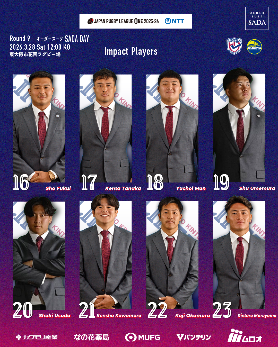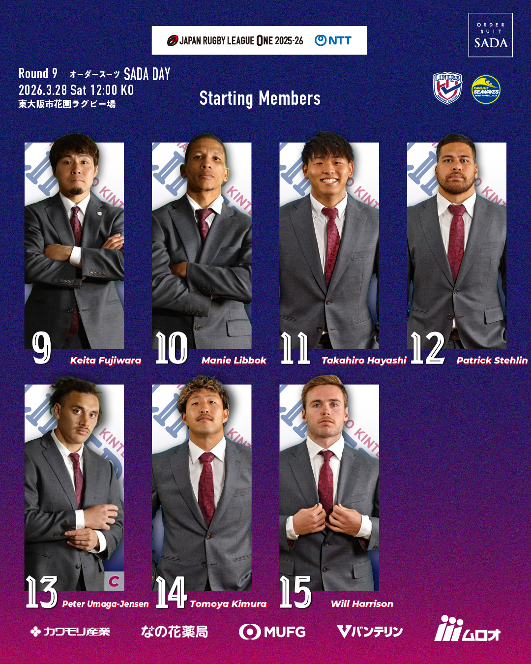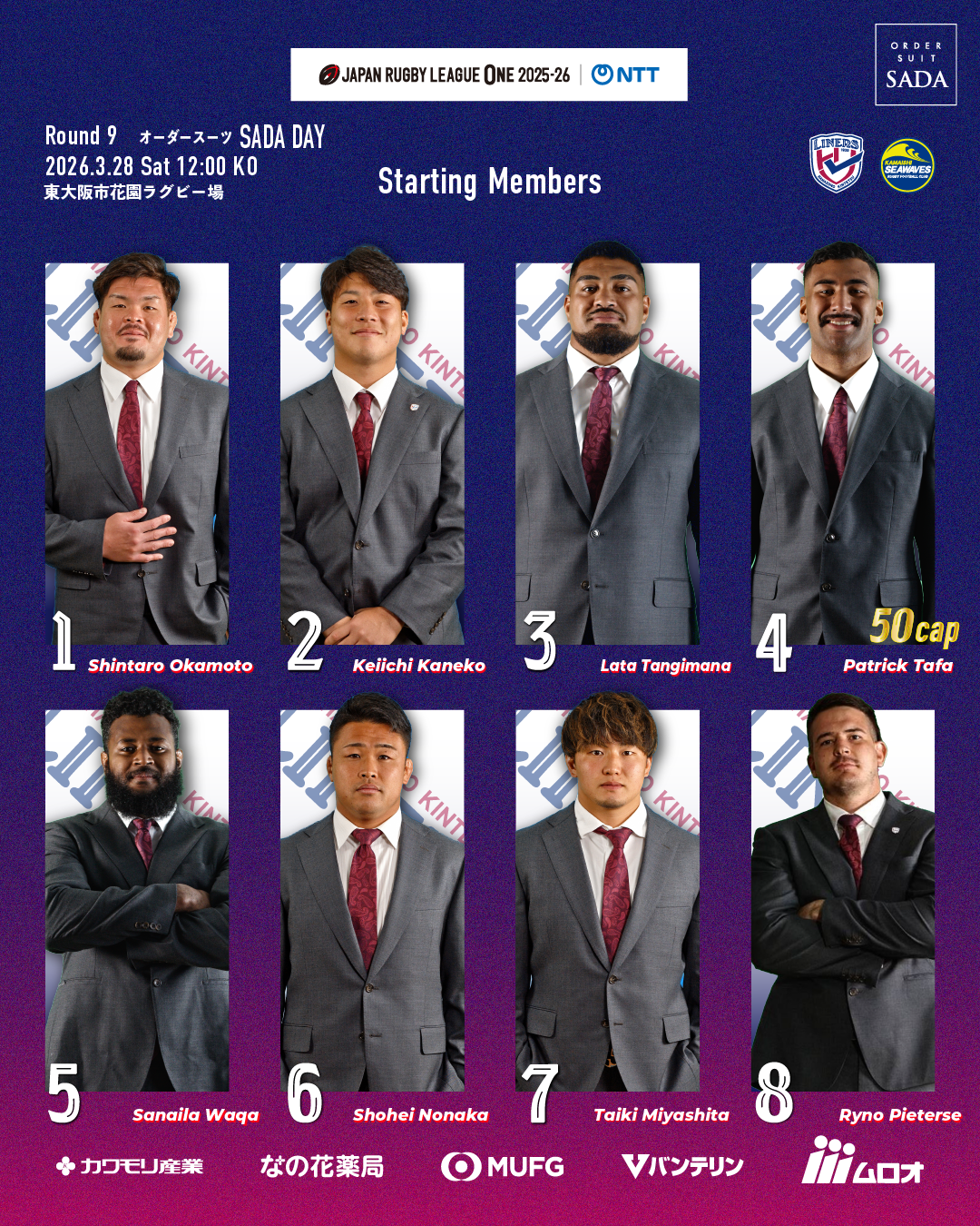 日頃は花園近鉄ライナーズへご声援を賜り誠にありがとうございます。NTTジャパンラグビー リーグワン2025-26 Div.2第9節 【オーダースーツSADA DAY】日本製鉄釜石シーウェイブス戦のご案内をいたします。