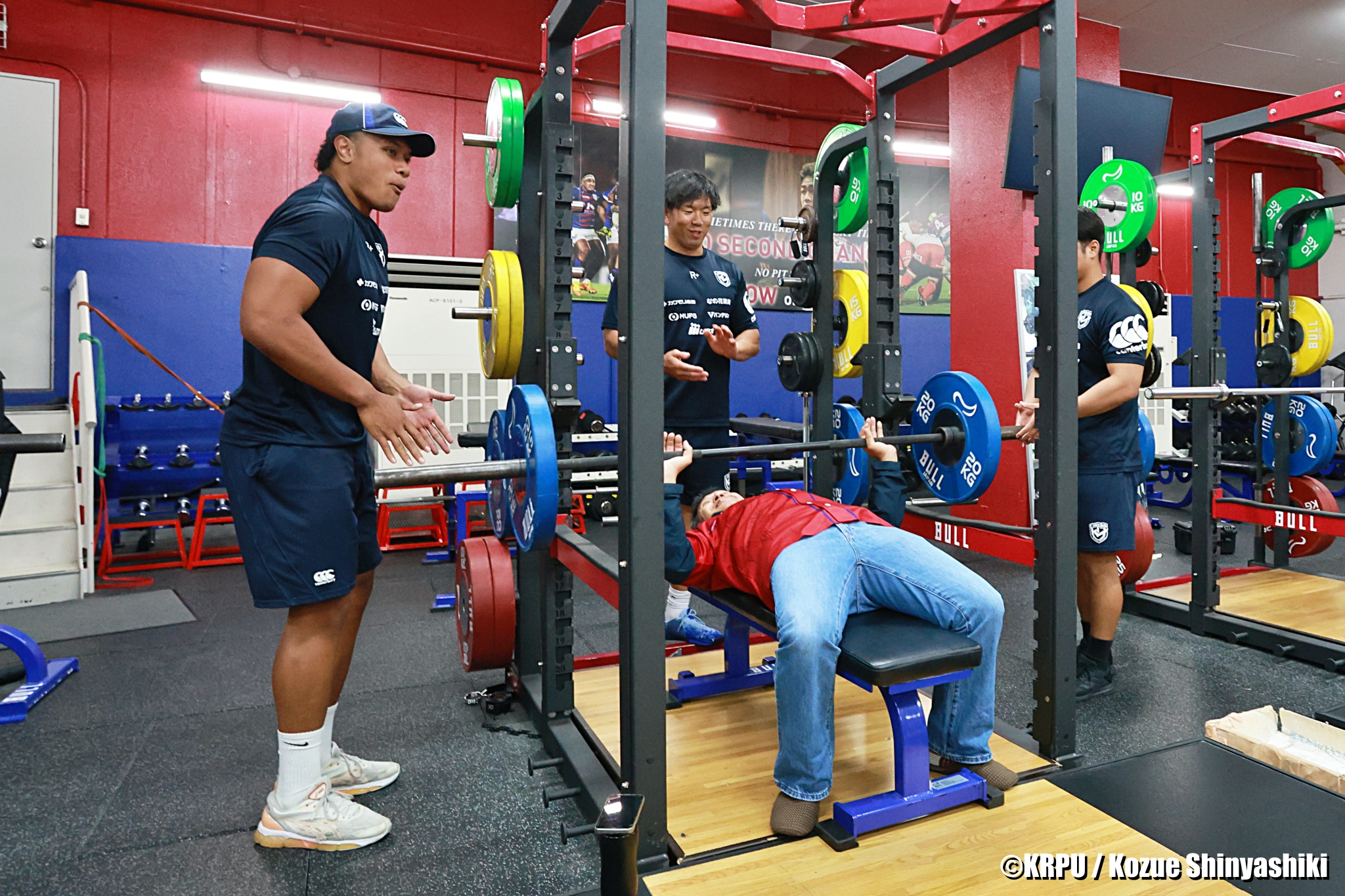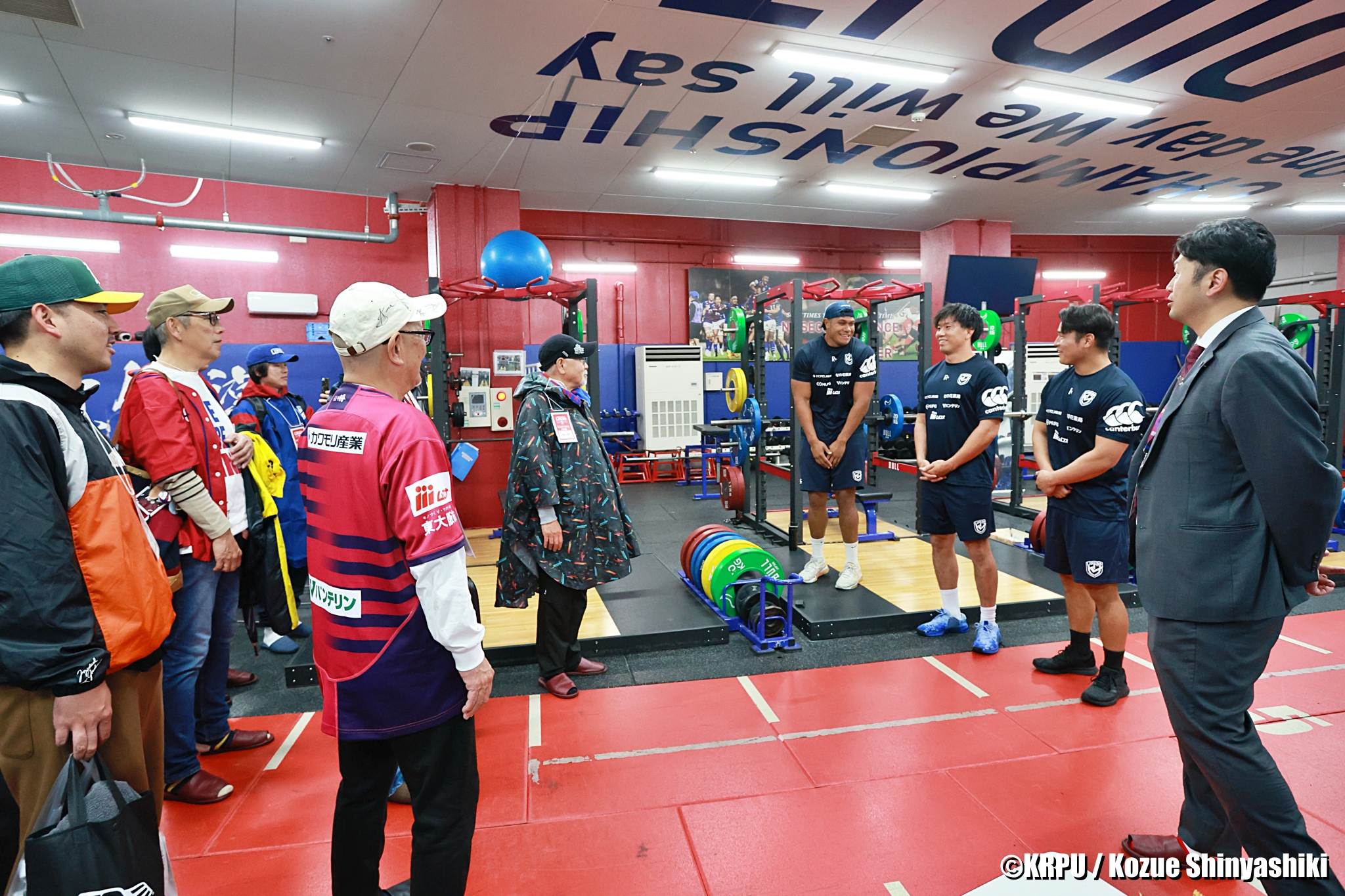 選手が普段練習しているチームジムやクラブハウス内を見学。ノンメンバーの選手がトレーニングしている様子をご覧いただいたり、実際にトレーニングの体験も。ヴィンセント・セフォ選手、菅原貴人選手、石浦大貴選手が同行し、マシーンの使用方法のレクチャーや普段のトレーニングの様子についてお話ししました。