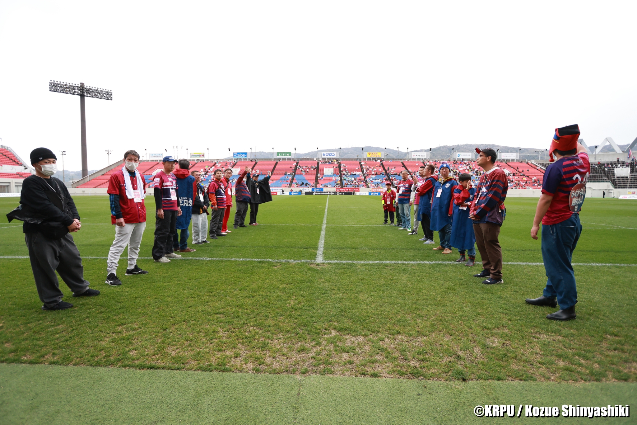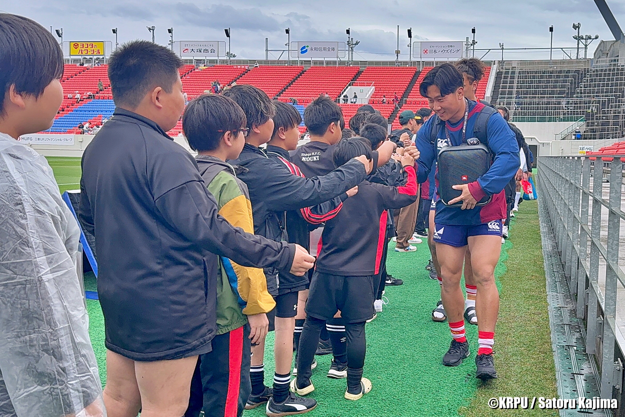 キックオフ直前、グラウンド上で花道をつくり、ロッカールームからグラウンドに入場する選手とハイタッチ。選手にエールを送っていただきました。