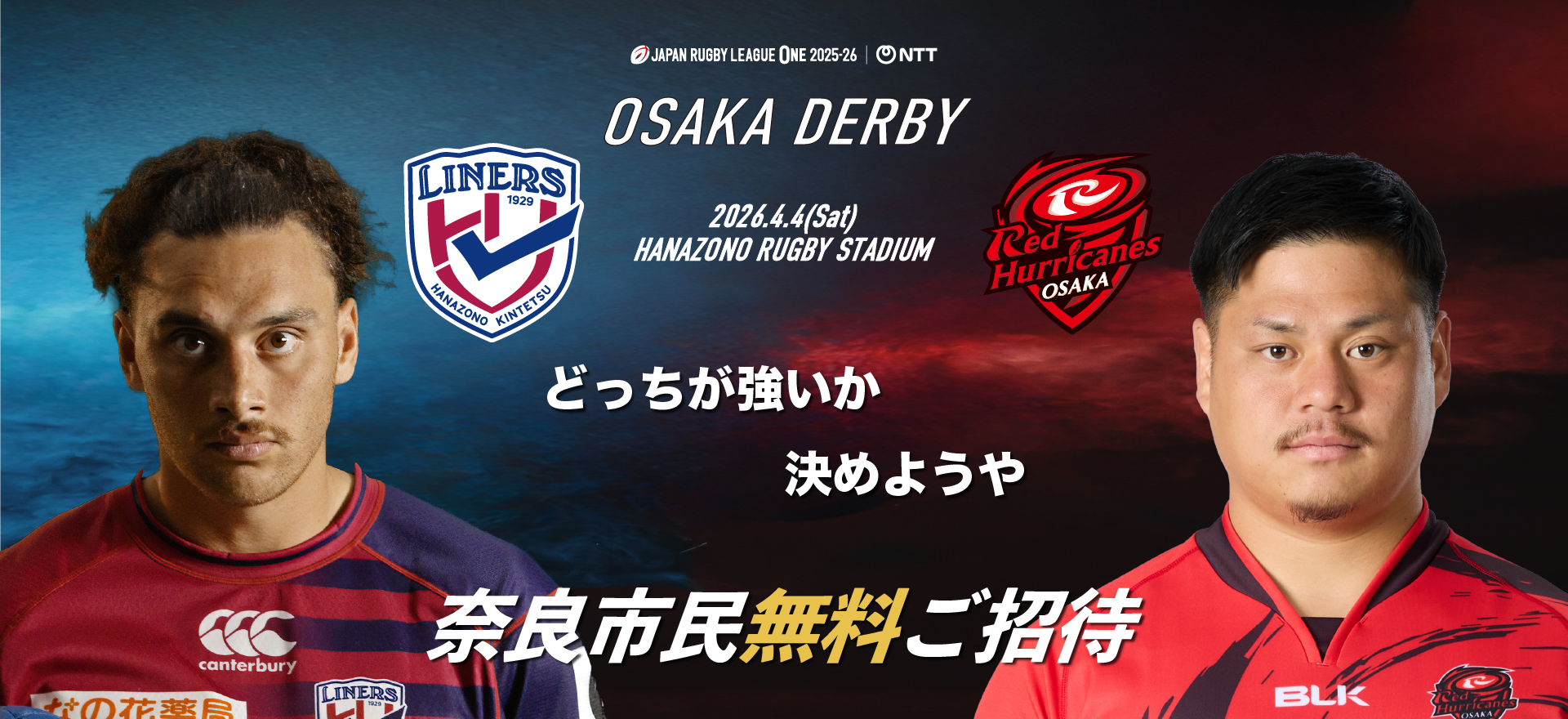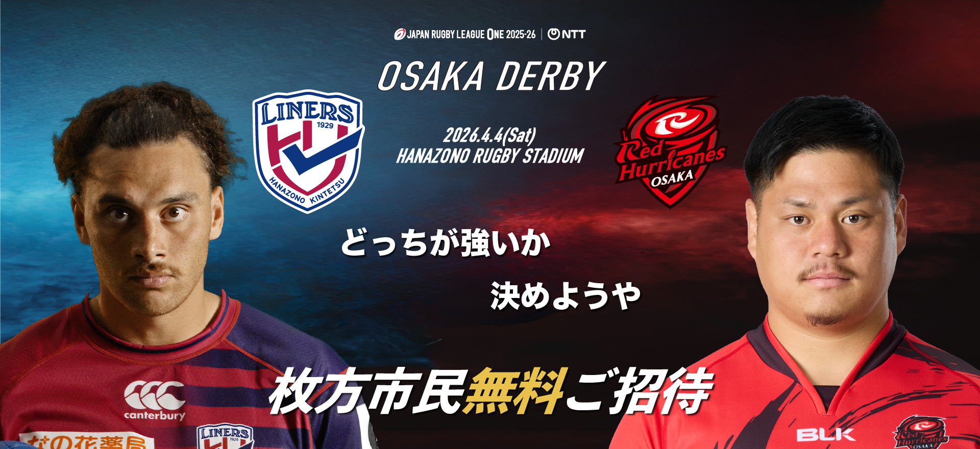 2026年4月4日(土)14:30K.O. vsレッドハリケーンズ大阪※東大阪市民のみなさまは、以下の試合においても無料招待いたします。